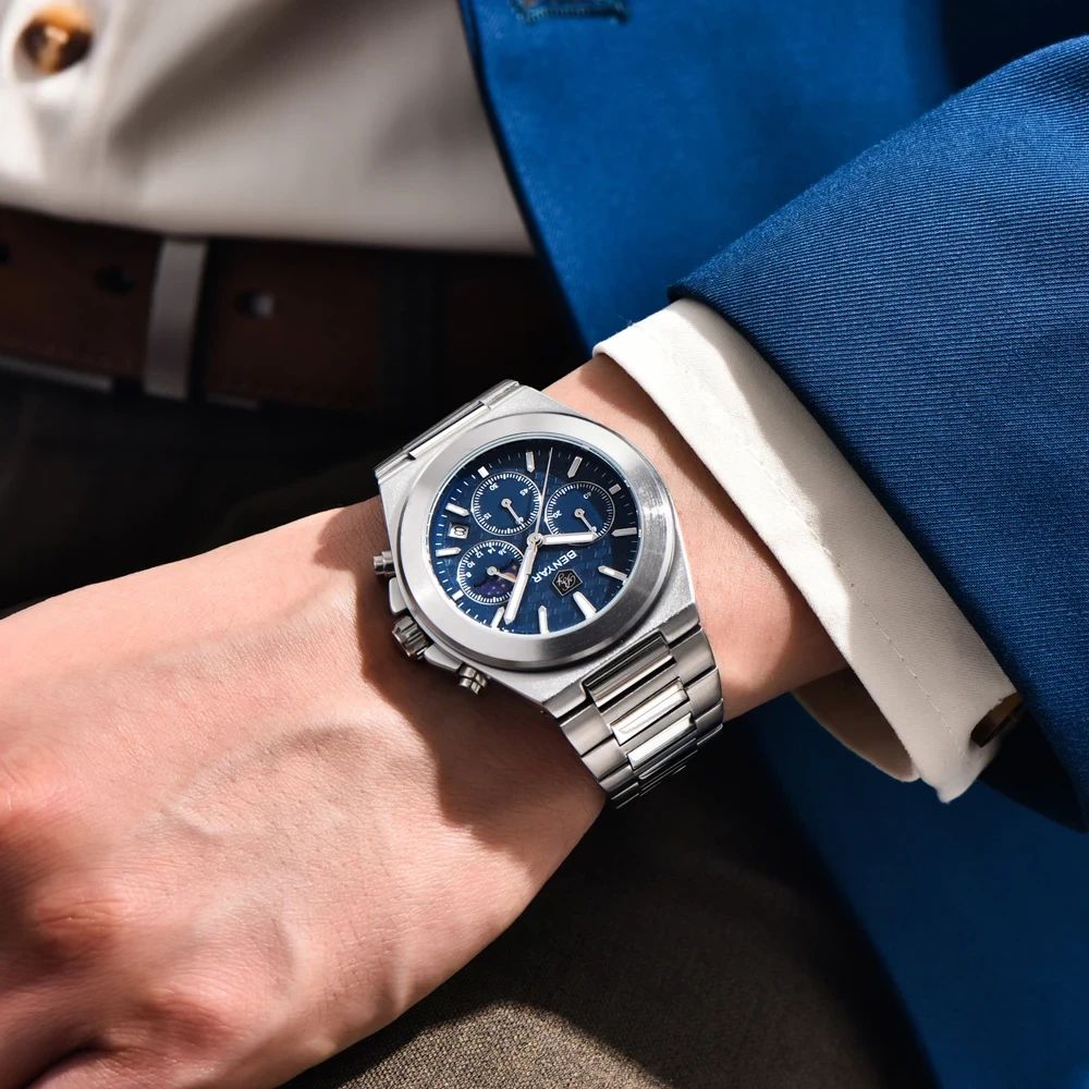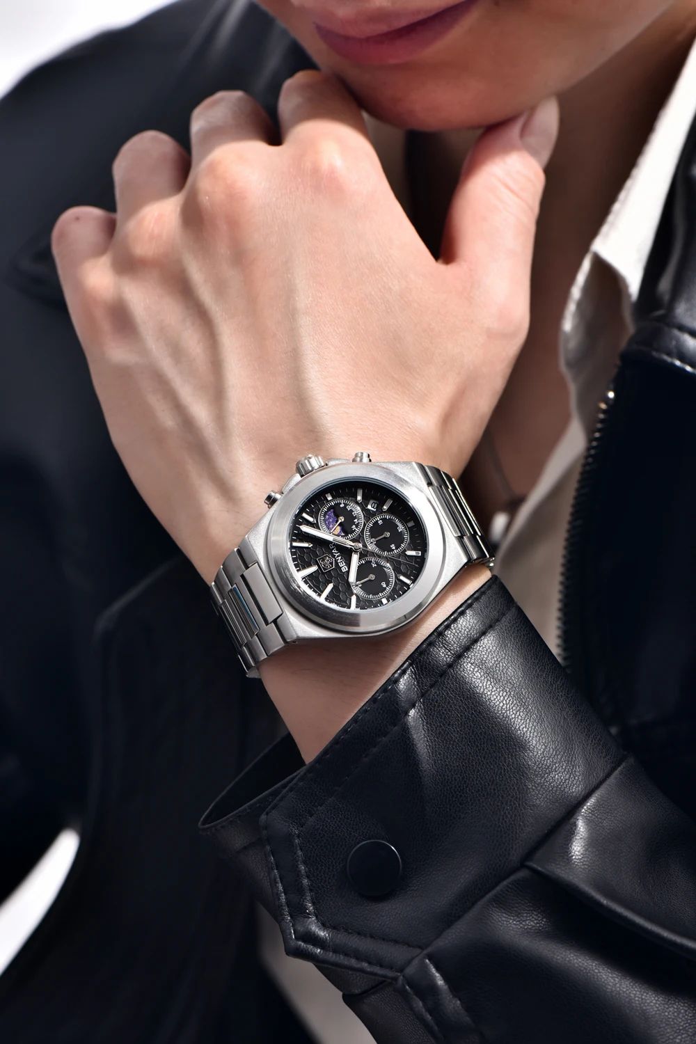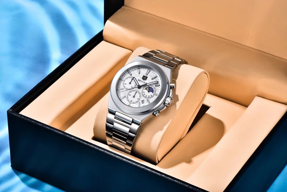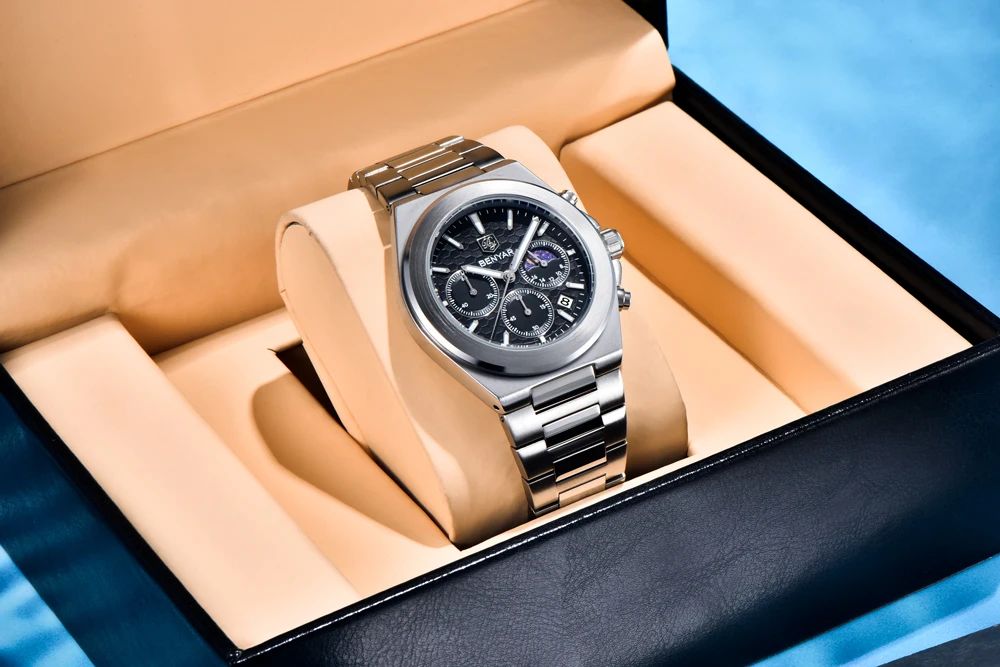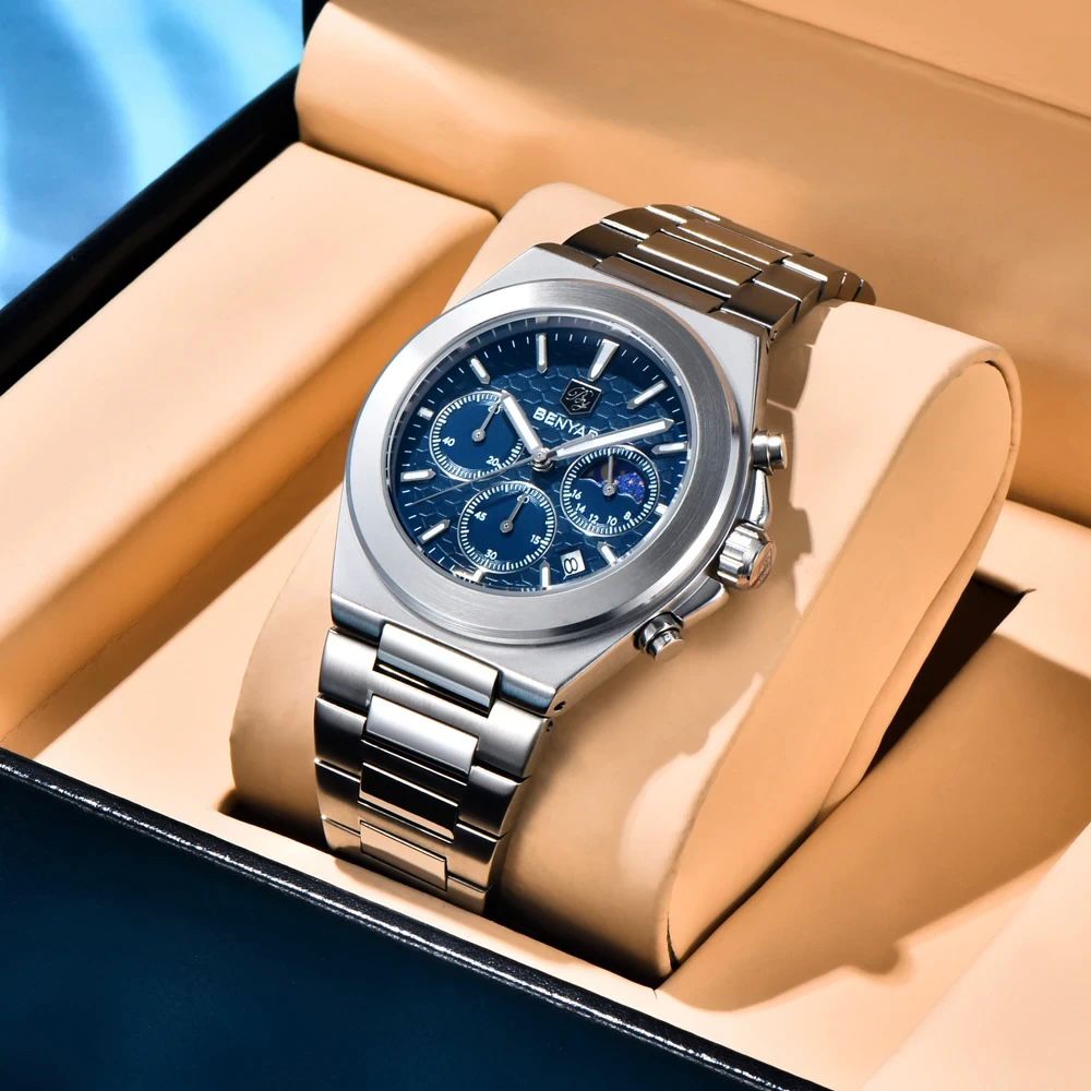 Elevate your style with this premium chronograph quartz watch, designed with a bold stainless steel case and bracelet for a strong, masculine look. Featuring a detailed multi-function dial, fully working chronograph, and date display, this watch combines precision with modern elegance. Built with a durable mineral-reinforced glass, it offers long-lasting shine, scratch resistance, and a comfortable yet heavy premium feel. Perfect for business, casual wear, and special occasions. Comes in an original gift box, making it an ideal gift choice.