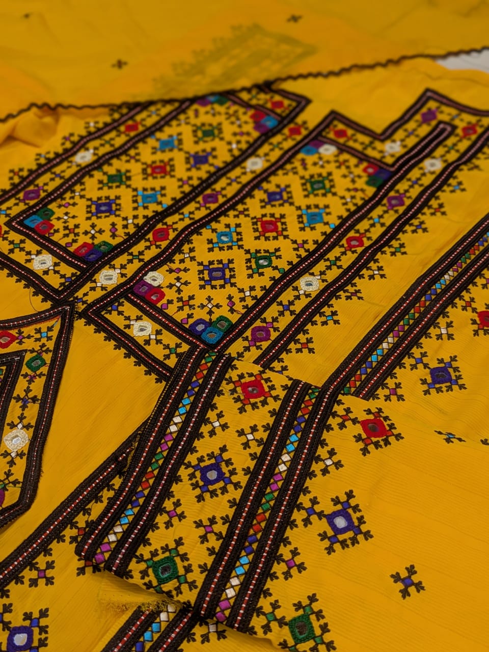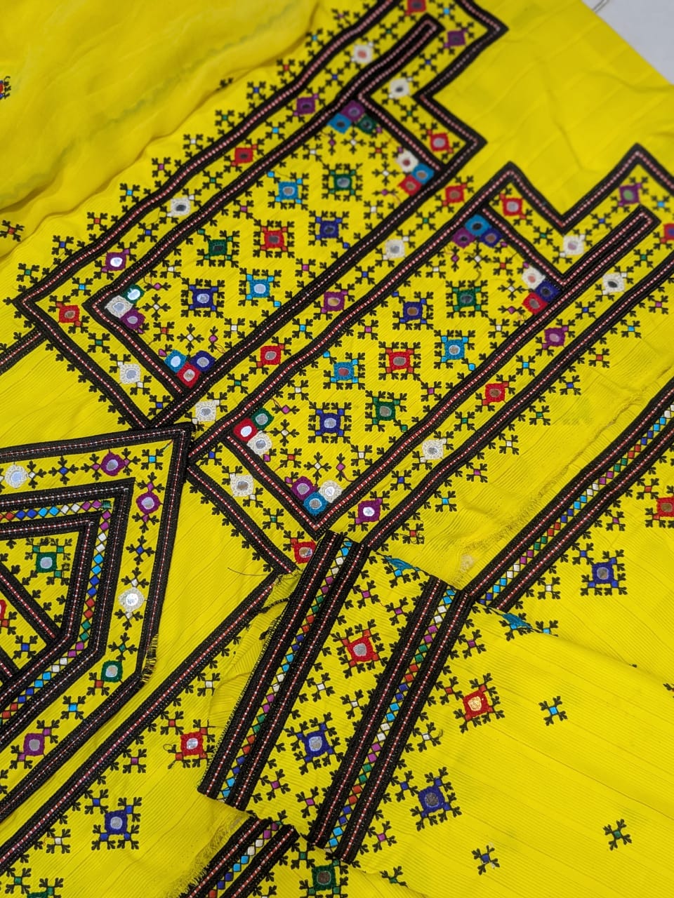 Shimmering Mirror Work: Expertly integrated mirrors (Sheesha work) catch the light beautifully, adding a layer of traditional sparkle and elegance to the vibrant yellow fabric.