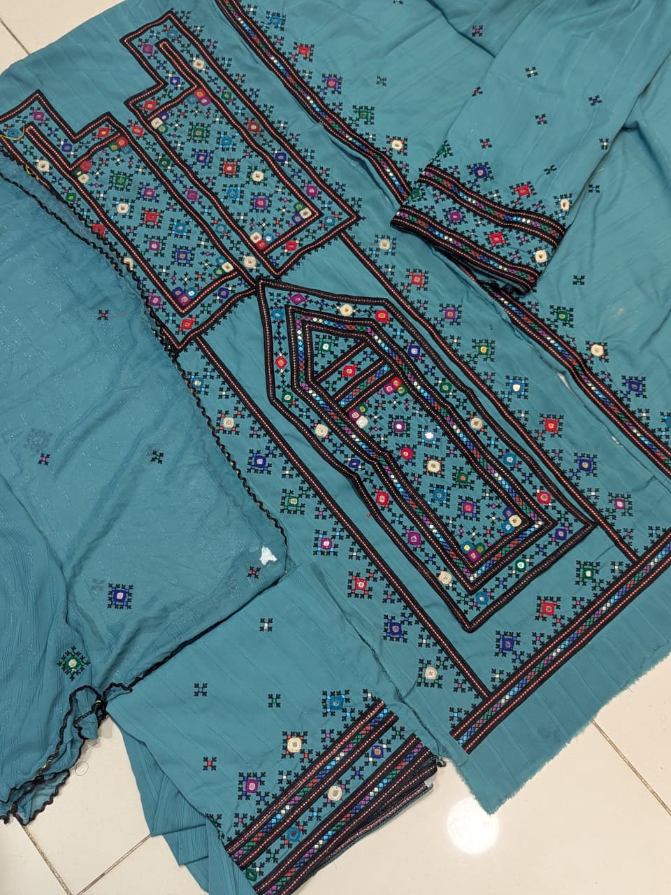 Embrace the timeless beauty of traditional craftsmanship with this exquisite 3-piece Handmade Balochi Suit. A true masterpiece of ethnic fashion, this ensemble features the legendary needlework that has been passed down through generations, making it a standout addition to any wardrobe.